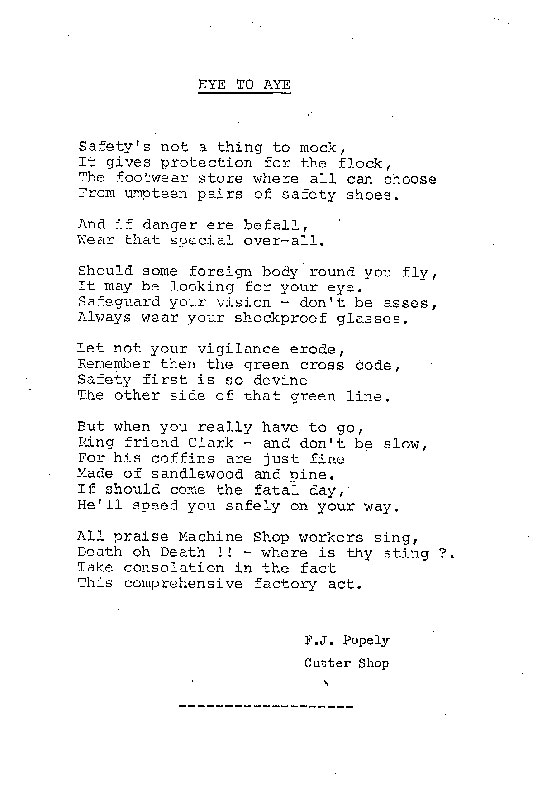 An early 1960s view of Health & Safety. Presumably the "comprehensive factory act" is the 1961 Factory Act, a major piece of legislation which consolidated all the previous Factory Acts from 1937 to 1959. The poem's author Fred Popely was a long-term employee, from 1933 to 1983.