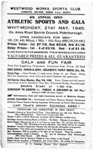 THE WHITSUN 1946 SPORTS DAY IS RAINED OFF - "Sports Days come and go, but occasions they come and don’t go and on Whit Monday the bottom fell out of the heavens and let go the lot, so the meeting was opened and closed within the period occupied by six pips on the BBC, to be resumed on the following Saturday, when the still inclement weather marred, but did not prevent the programme being carried through.
